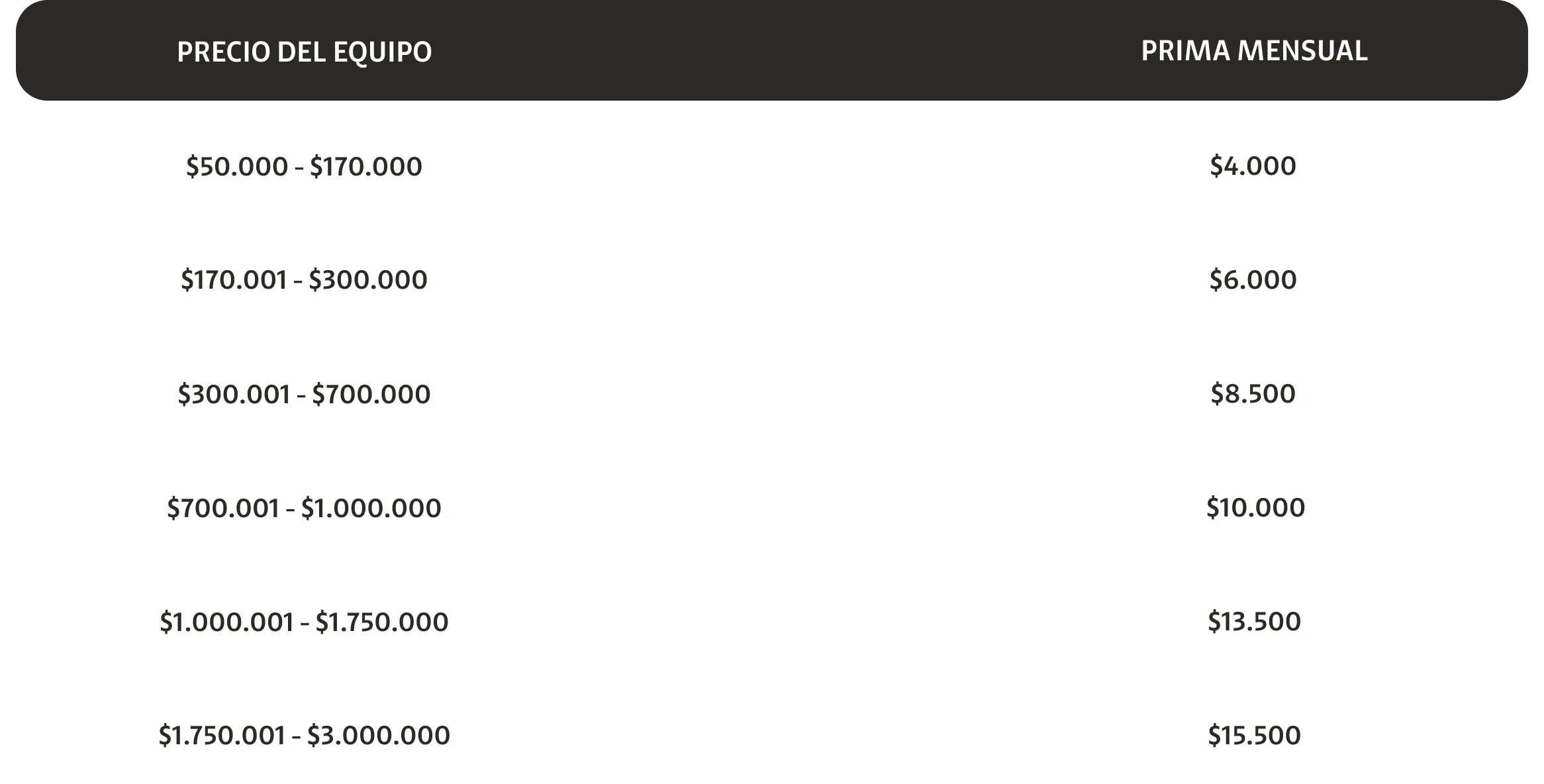 La prima es mensual y será cobrada en la boleta de servicios de telefonía de Claro. El valor de la prima será calculado en función al precio prepago del equipo asegurado sin aplicar subsidios, descuentos, promociones o rebajas. Cifras en pesos chilenos. Incluyen el IVA.